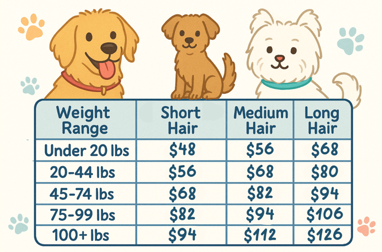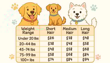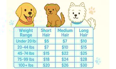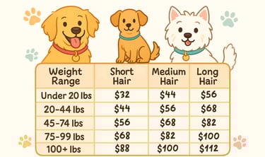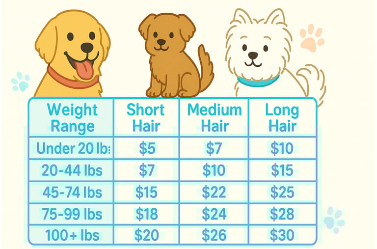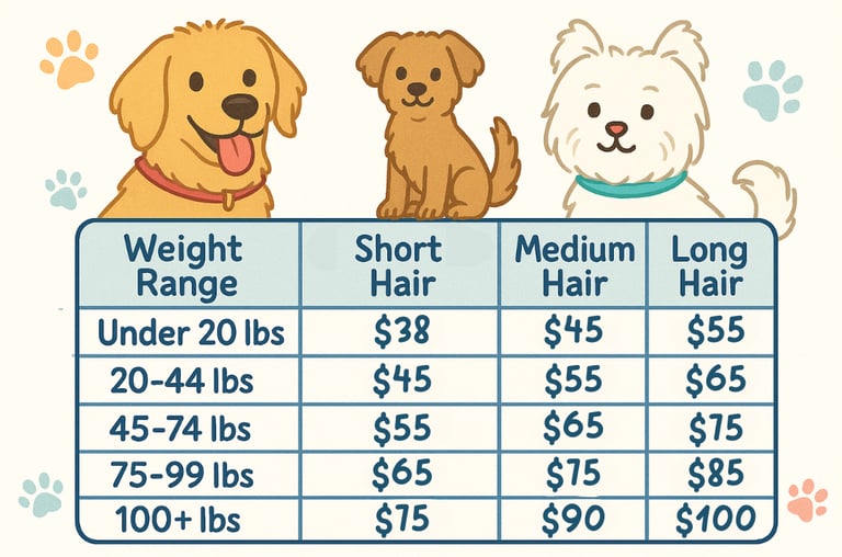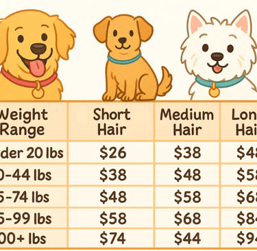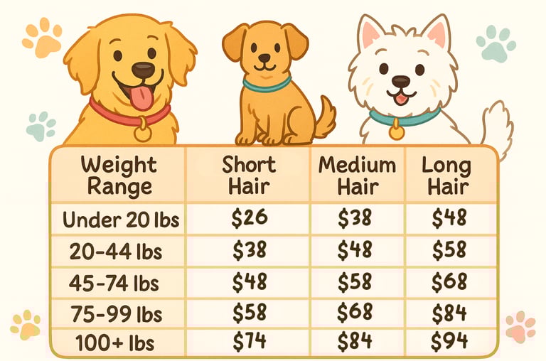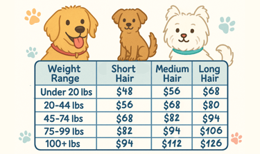 Includes brushing, massaging shampoo, blow dry, designer doggie cologne and bow/bandana.